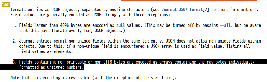 journalctl's JSON output to get them back out, to check whether the message arrives in the systemd journal as it was intended to.Motivation