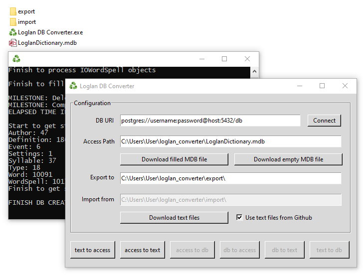 Using this program is simple. Just run the Loglan DB Converter.exe file, fill in the required fields and push the button with the desired conversion process. The additionally opened command line console will display the progress of the conversion.