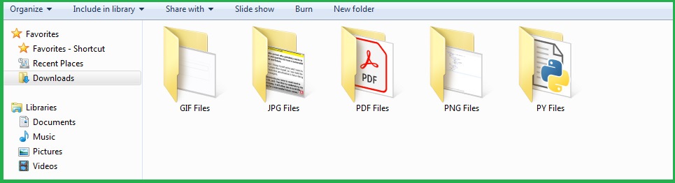 - Run a loop for all of the files, putting them in the appropriate folders based on their extensions.