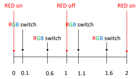 We want one Red LED to blink (on/off) every second, and the second LED (RGB) to blink (change to next color) every 0.5 seconds. The two LEDs should be out of phase by precisely 0.1 seconds (see diagram below). Use TimerA0 in UP mode (and corresponding interrupts) to trigger the RED LED and TimerA1 in UP/DOWN mode (and corresponding interrupts) to trigger the RGB LED.