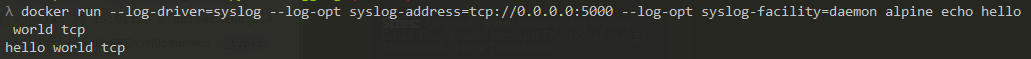 docker run --log-driver=syslog --log-opt syslog-address=tcp://0.0.0.0:5000 --log-opt syslog-facility=daemon alpine echo hello world tcp