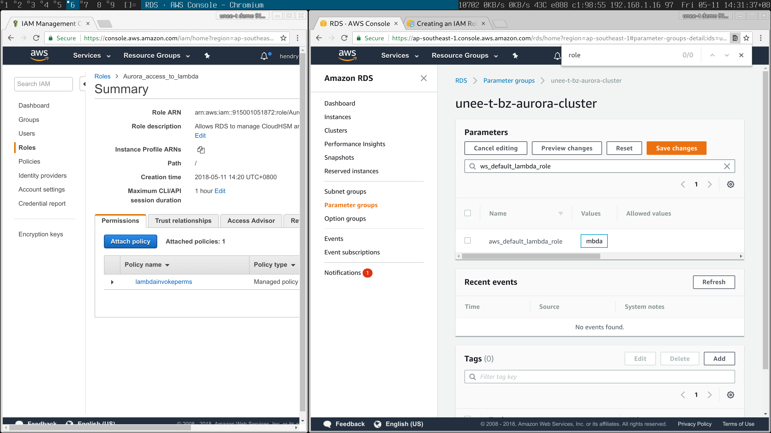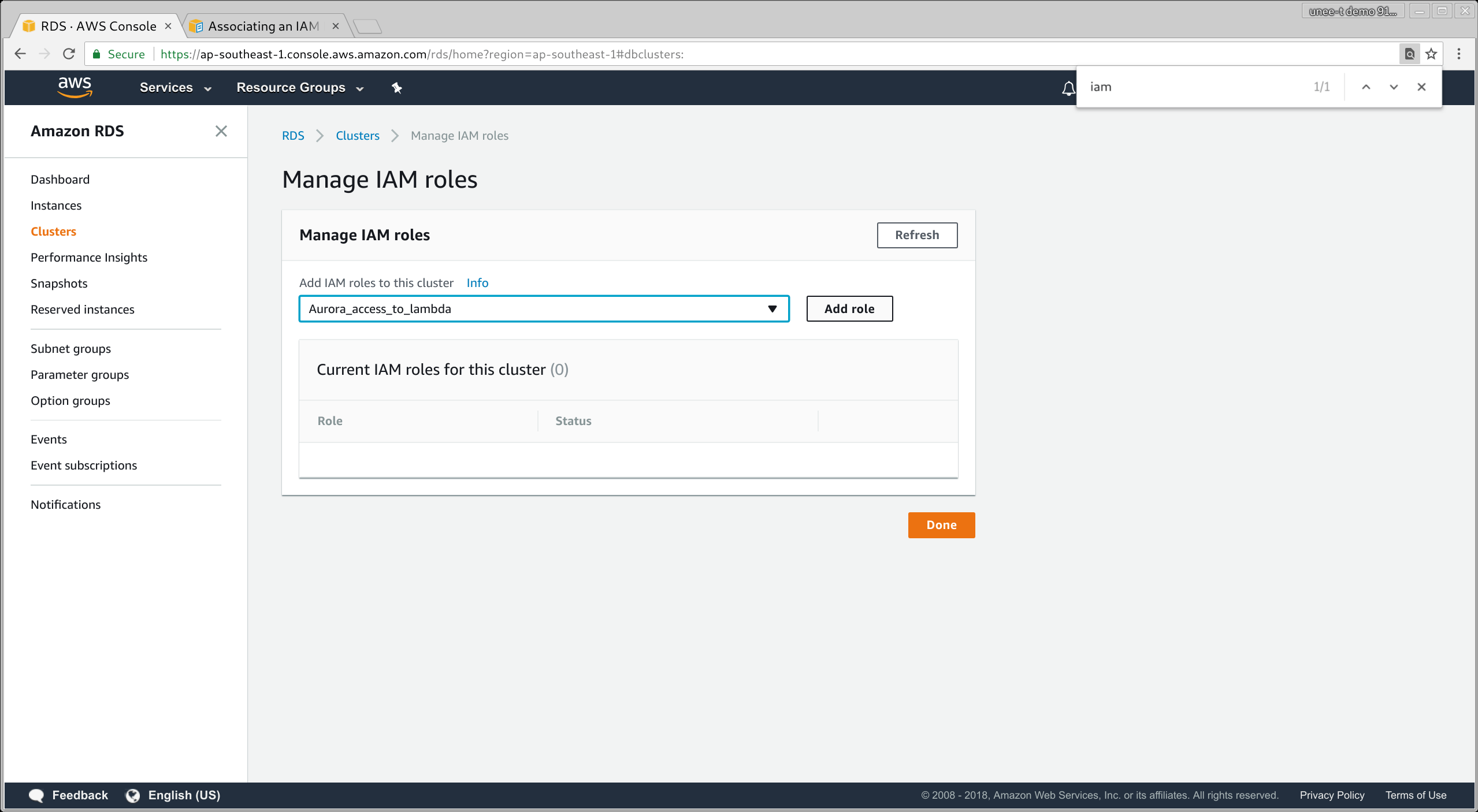 You need to IAM roles to this cluster https://ap-southeast-1.console.aws.amazon.com/rds/home?region=ap-southeast-1#dbclusters:
