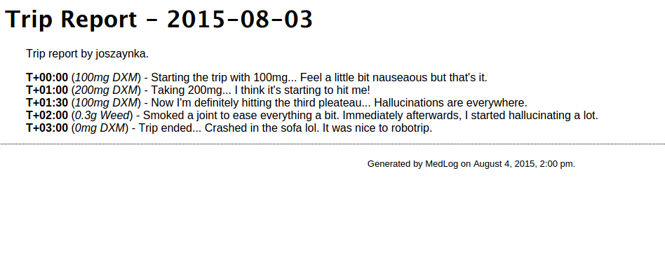 This can be used for logging all ingested drugs, both legal or illegal. It has many purposes, the main ones being:
