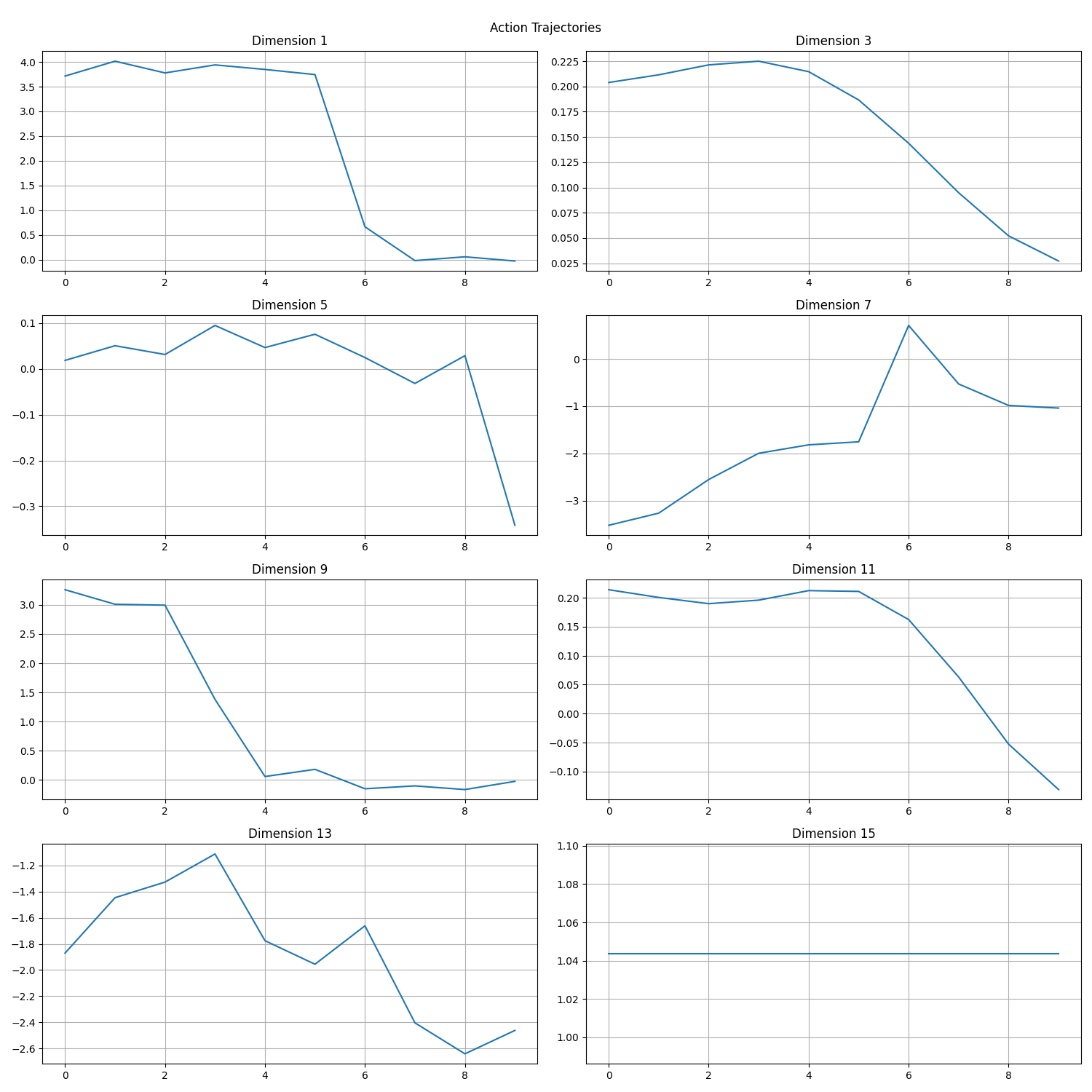 Figure 2: 0th Harmonic Only (DC Signal) This shows reconstructions using only the 0th DCT coefficient (DC component). This essentially captures the mean value of each action dimension - which is why we see flat lines. While this provides the general position for each dimension, it lacks any temporal dynamics.