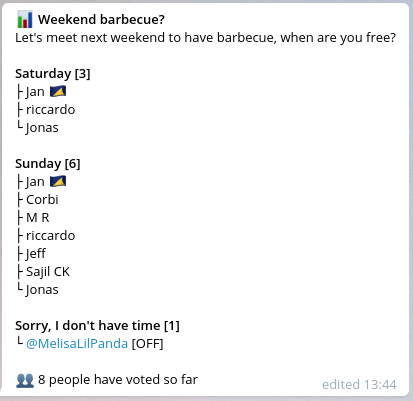 An example: You want to hang out with your friends, but don't know when they are free? Normally, you would just ask when to meet, resulting in dozens of messages being send and staying on top of it getting out of hand. So, instead of whipping out the old pen and paper and counting people by hand, just ask the GroupAgree Bot kindly to do that for you: