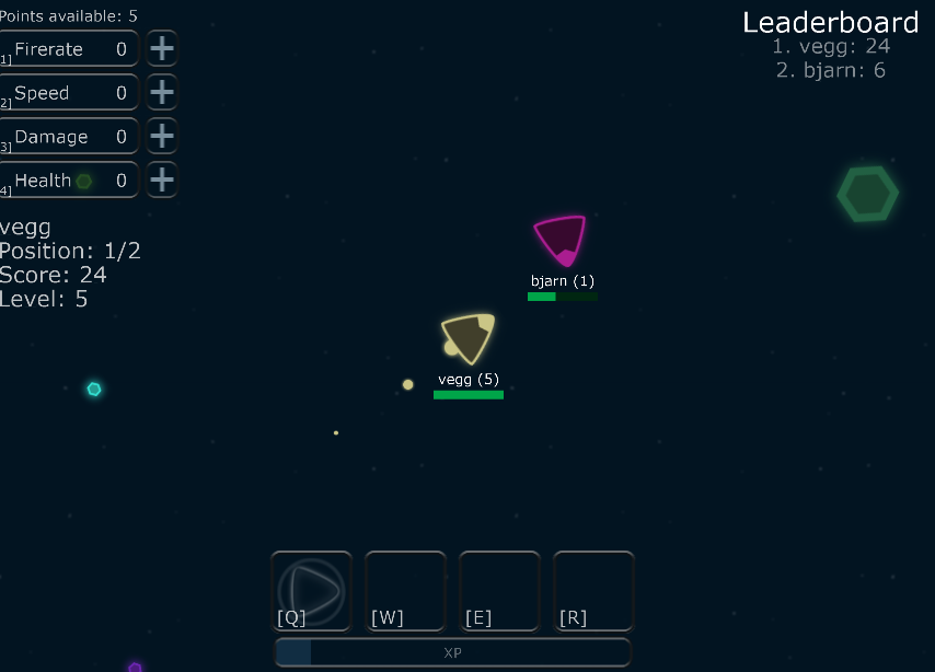 A io-styled multiplayer game. Level up, allocate your points, choose your hero powers and pewpew!