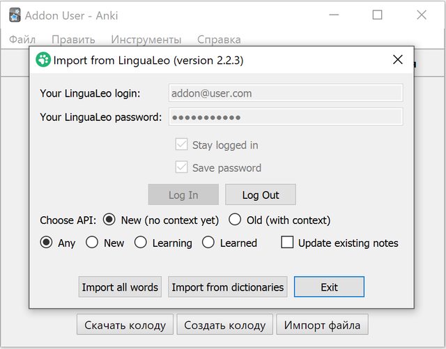 To run the add-on go to the "Tools" menu and click "Import from LinguaLeo." Enter your login and password. If you'd like to stay logged in choose "Stay logged in" option, and you can also save the password (stored in the configuration file), and click "Log in" button. If the authorization is successful, you can choose the words to import: "All" (no matter what status), "New", "Learning" or "Learned". If you updated media for some notes that had been previously imported, choose "Update existing notes" option.
