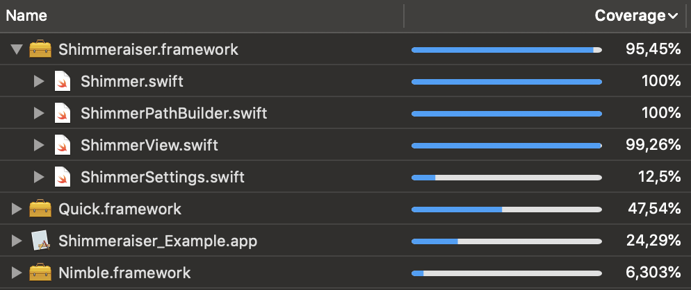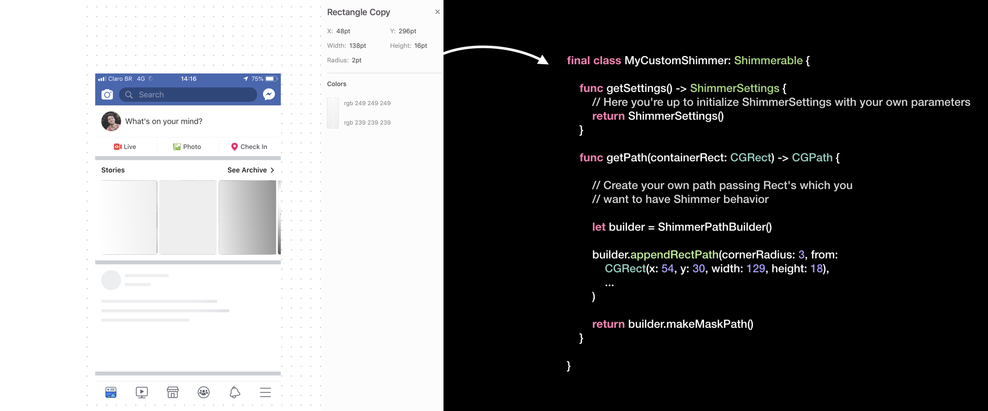 pod 'Shimmeraiser'This class corresponds to the respective layout you want to represent when loading the content. In this file you needs basically to import Shimmeraiser and add all CGRects provided by your UX team to a ShimmerBuilder object. You need to return a ShimmerSettings which you can use the default init or set your own parameters as the animation duration, if the animation is reversible, the size of the animated shadow, and the color.
