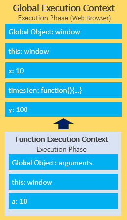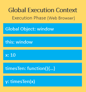 在执行阶段, JavaScript 引擎逐行执行代码. 在这个阶段, 它为变量赋值并执行函数调用.