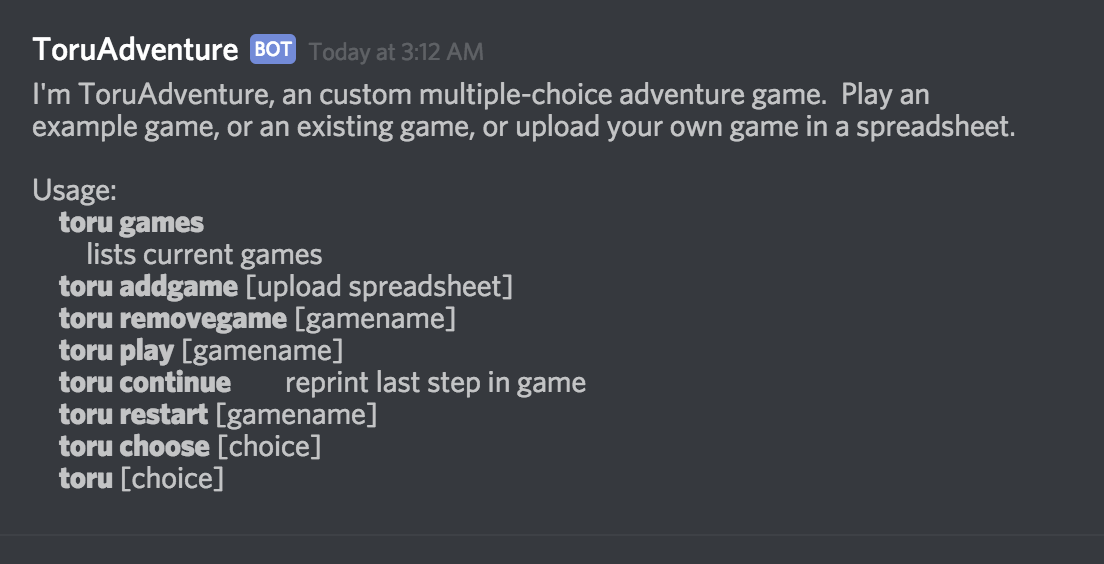 ToruAdventureBot is a Discord bot for sharing custom multiple-choice adventure games.