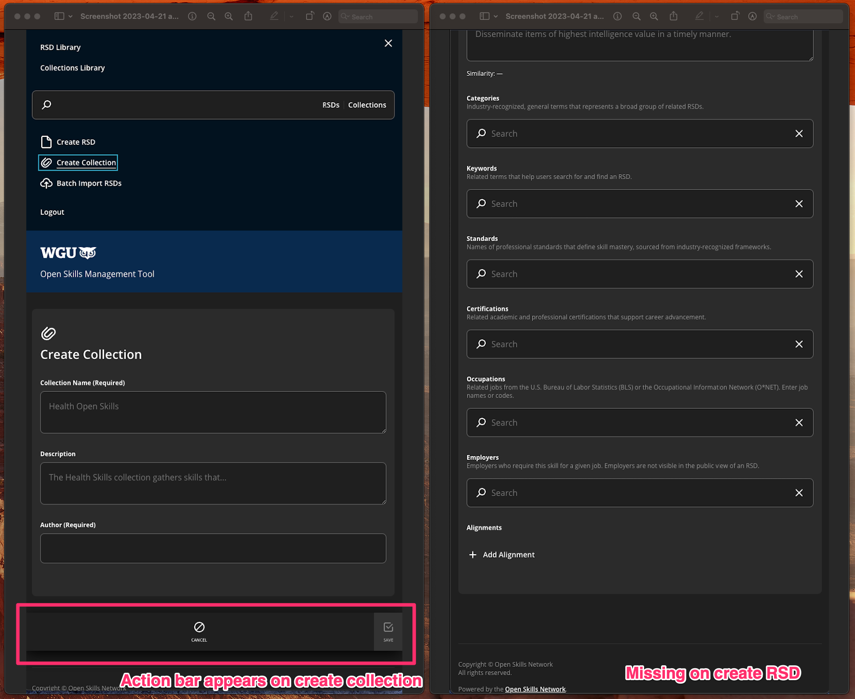 On a mobile breakpoint the form save button is supposed to appear in an action bar like it does on the create/edit collection form, but it is not appearing for some reason. The consequence is that you can't save a new or updated RSD on mobile breakpoints.