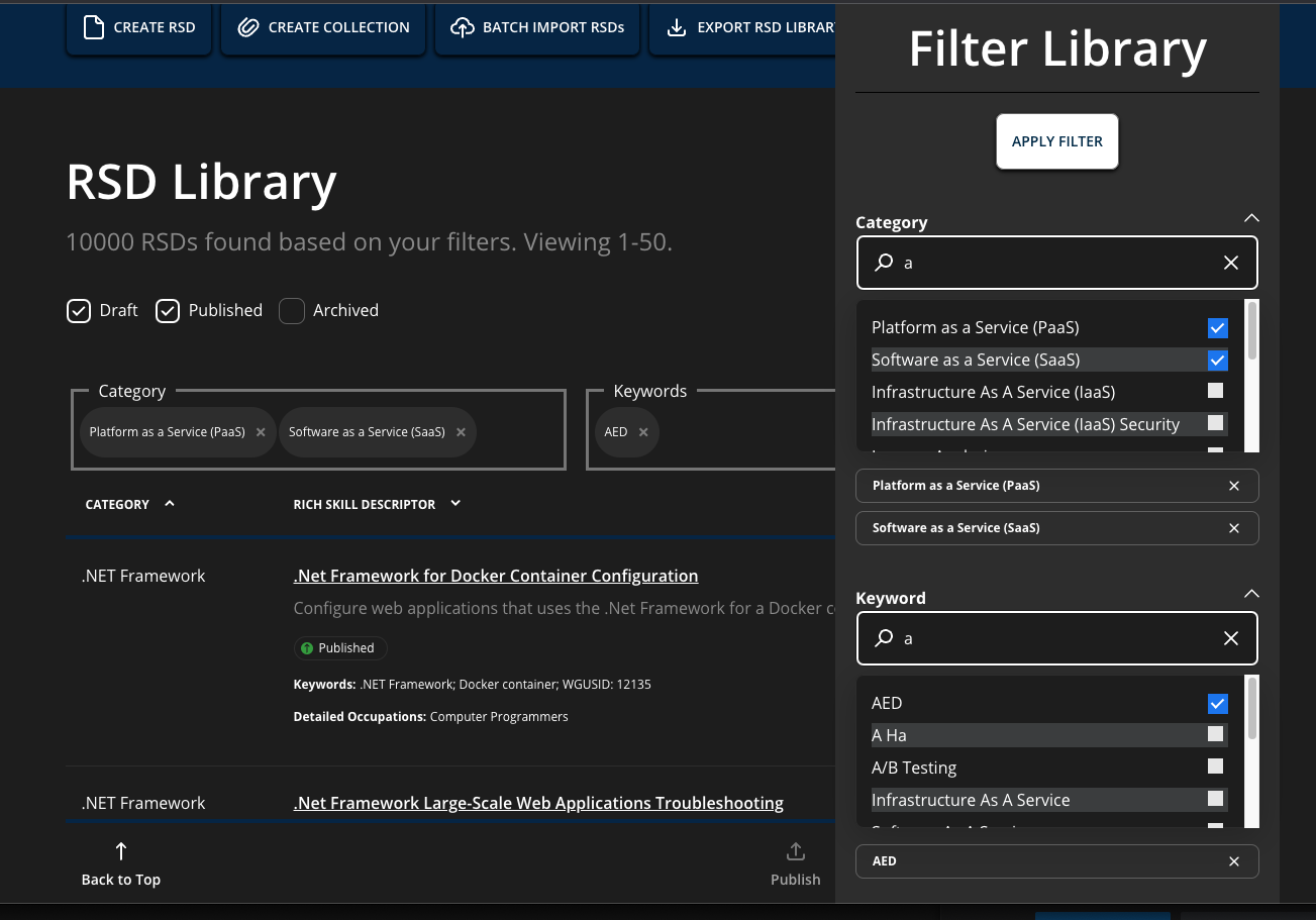 Added ability for RSD library, Collection and also Workspace to use filters and search results, similar to Excel's column filters. These filters are applicable to: