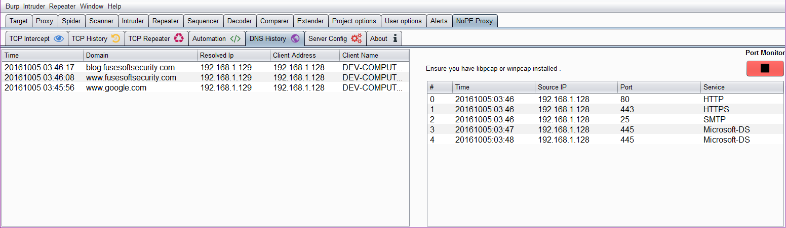 - A configurable DNS server. This will route all DNS requests to Burp or preconfigured hosts. It makes it easier to send mobile or thick client traffic to Burp. You need to create invisible proxy listeners in BurpSuite for the Burp to intercept HTTP traffic or you can use the second feature of this extension to intercept binary/non-http protocols.