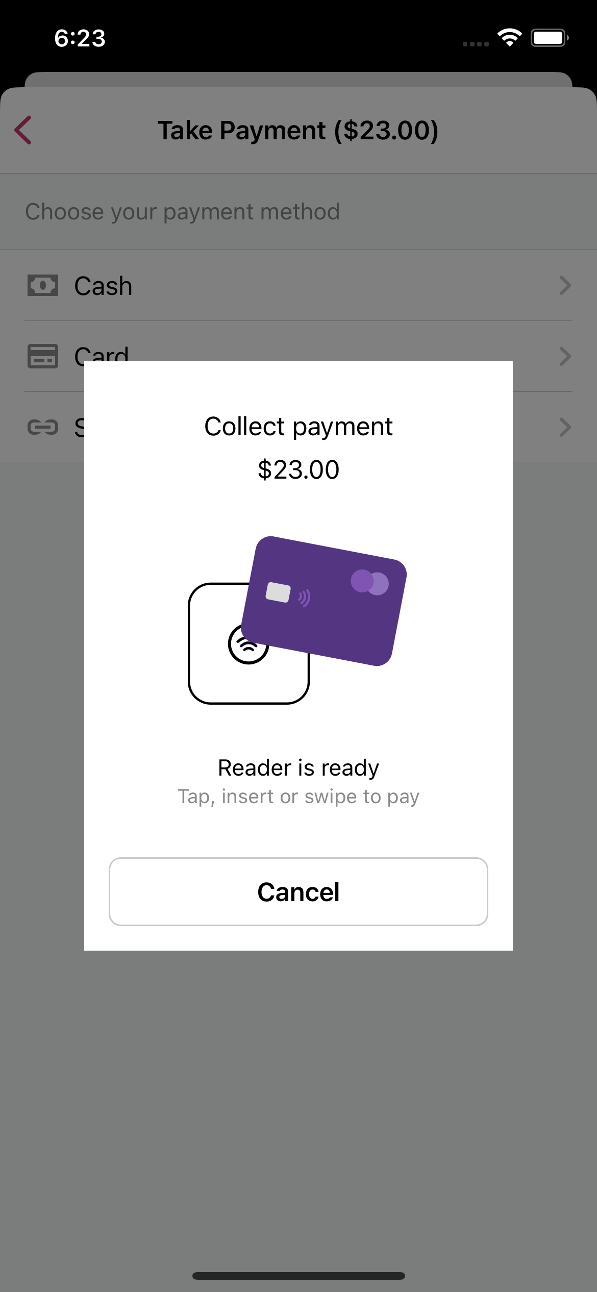 Menu > Payments > Collect paymentTake paymentCardReader is readymessage is shown withTap, insert or swipeas mentioned payment methods.Using a CA store with a WisePad 3 reader