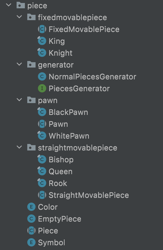 우선 fixedmovablepiece, generator, pawn, straightmovablepiece 패키지가 동일 레벨인 상황인데 직관적이지 못한 느낌이고, Color, EmptyPiece, Piece, Symbol 역시 piece 바로 하위에 위치하고 있는데 조금 더 고민이 필요해 보입니다.