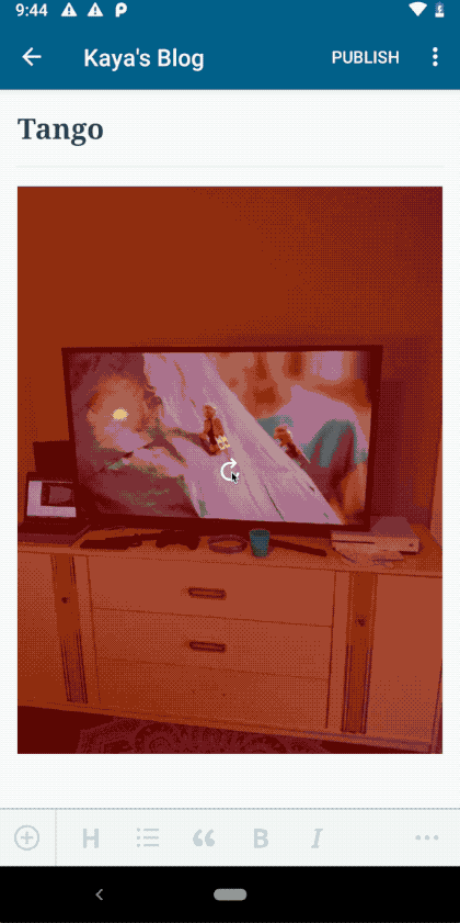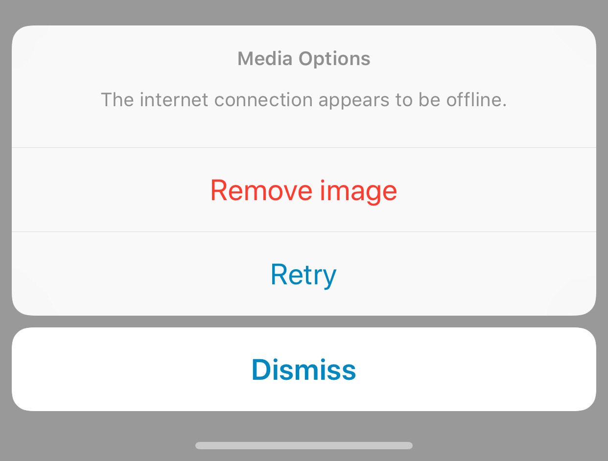 This is what happens when I tap on the image again after tapping on retry. It shows an abort confirmation dialog. In the end, you can see that the image was successfully uploaded and the overlay, button, and message have disappeared. |