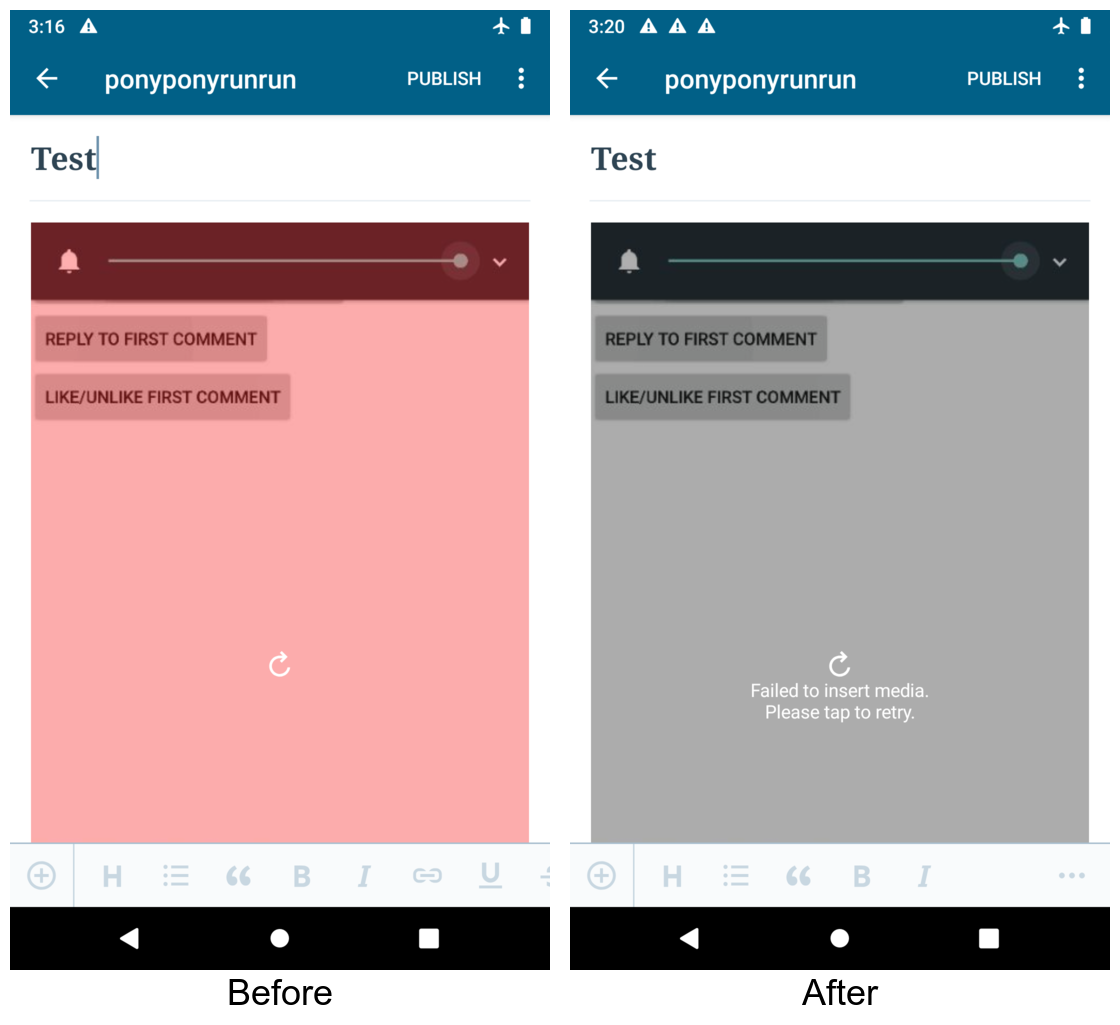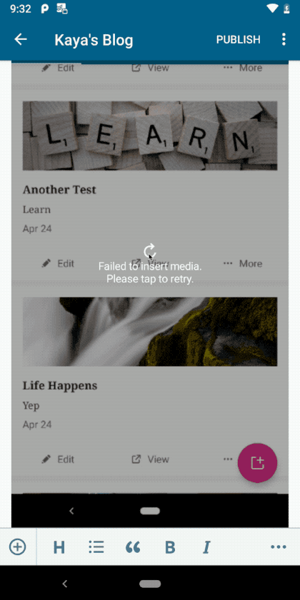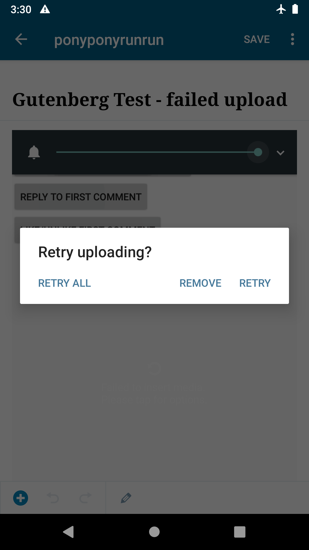Last note: IMO, the current experience in Aztec is not great, it's a only a "tap to retry" action, I much prefer the Gutenberg way, it opens a dialog with different options: