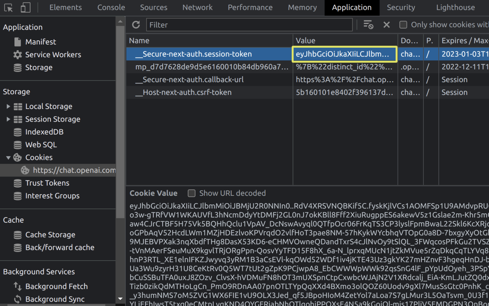 - Copy the value for __Secure-next-auth.session-token and save it to your environment.