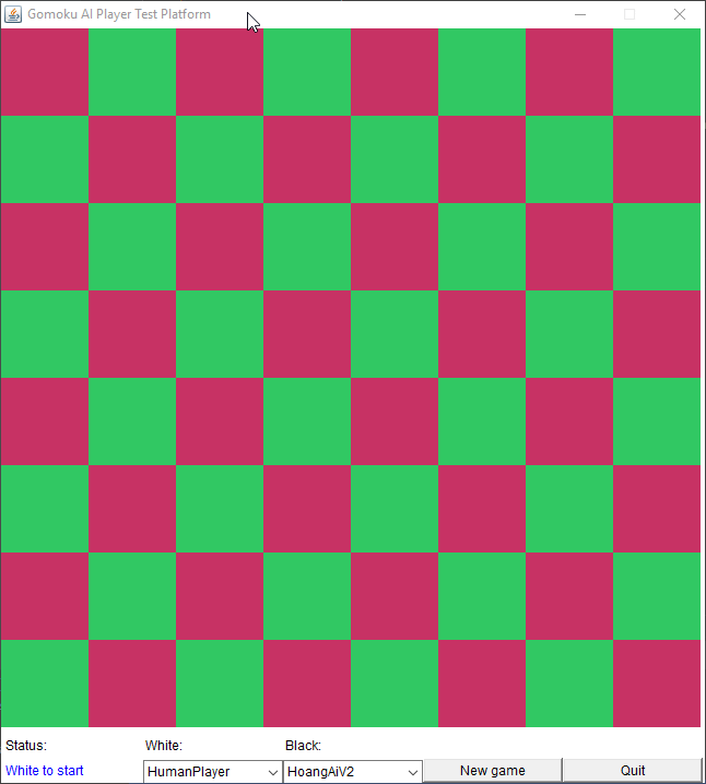 A Java class (GomokuReferee.class) is provided for developing and testing your player. This includes a graphical interface which allows you to play against your programme or watch games between computer players. It automatically finds any player classes which are in the same directory as you call java GomokuReferee from). GomokuReferee takes the following optional arguments: