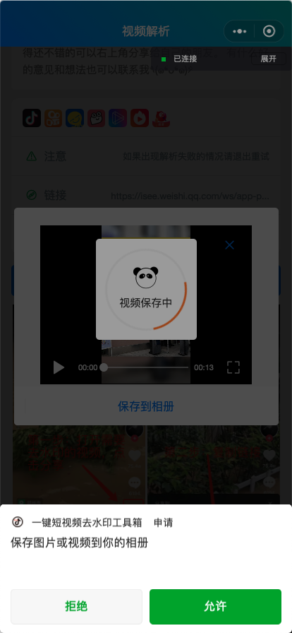 短视频去水印工具【微信小程序端】 扫码预览 如需搭建同款小程序请联系vx:w21001022 界面展示 功能 大多短视频平台视频去水印 无水印视频下载 福利广告接入页 帮助页 个人信息页 积分签到 查询历史解析记录 历史解析记录下载 更多功能更新中... 项目简介 样式基于ColorUI 视频解析服务端(Java版本) 项目运行 启动视频解析服务端(Java版本) 修改app.js文件url 修改request.js文件
