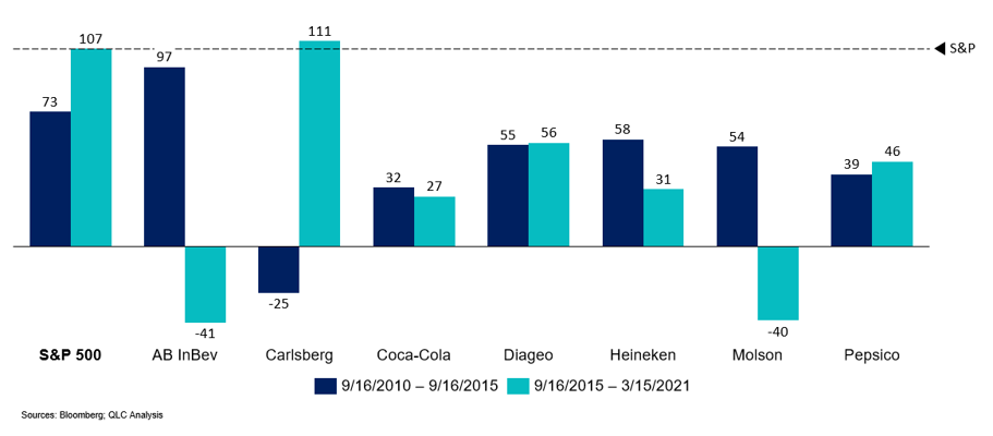 It is hard to discuss the past decade of global beverages industry without focusing on AB InBev. In the five years before the Megadeal fusing global brewing giants SABMiller and AB InBev (ABI), ABI outpaced SP500 returns by 24% percent. The nearest surviving player, Heineken, lagged by 19%. Since that time, ABI has not only lagged the SP500, but has lost value, close to 40% of the value of the firm at the time of the acquisition announcement.