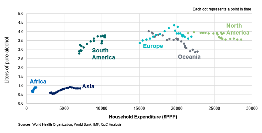 While there are numerous circumstances and peculiarities that help explain the drop, within the undercurrent are emerging secular trends that pose existential challenges to the global beverages industry. One such trend is the flattening of per capita consumption, illustrated below for beer.