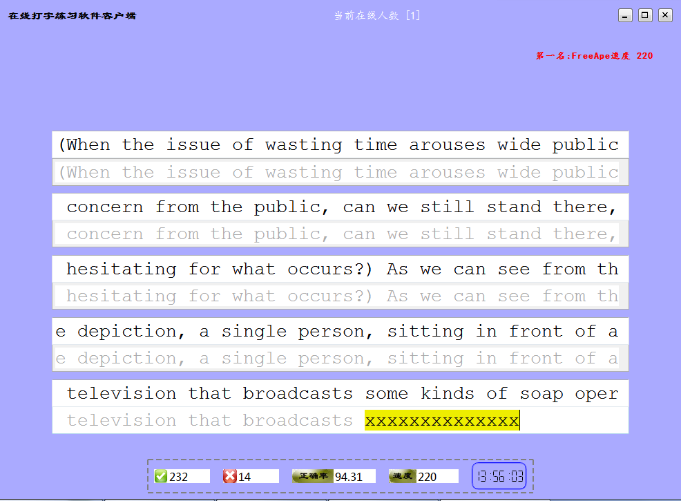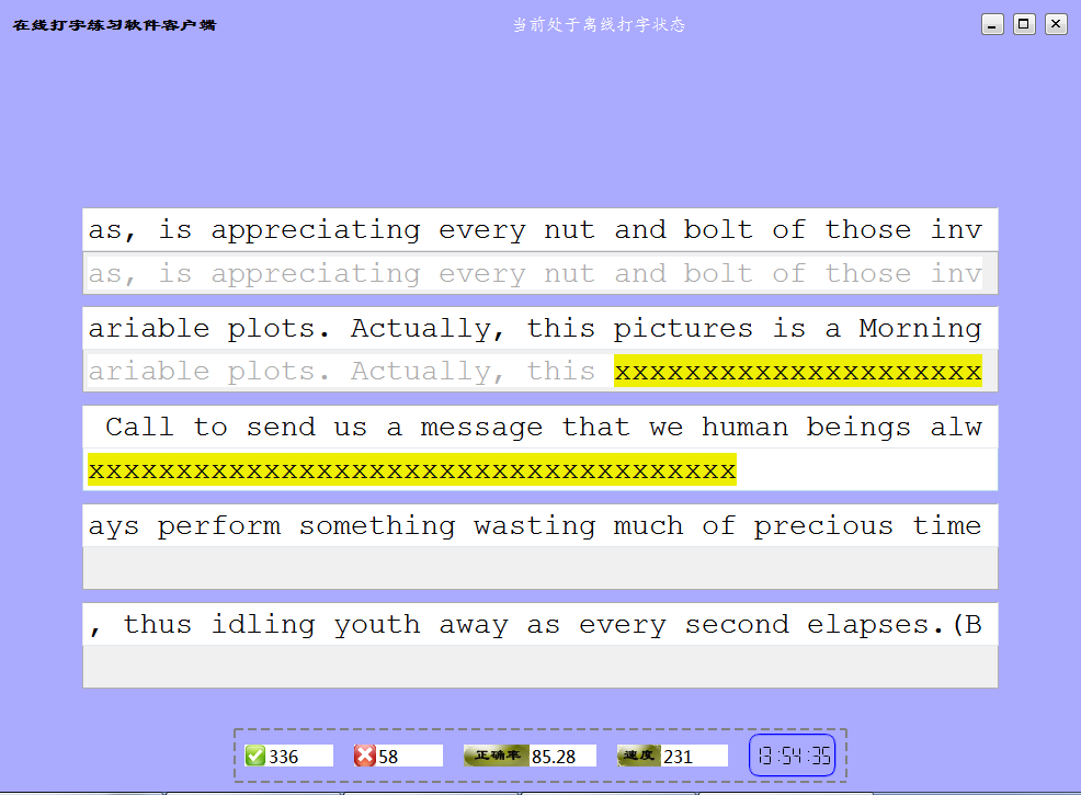 更新打字数据。客户端可实现离线打字练习以及在线打字练习,其中在线打字练习可以与在线用户比拼打字速度,并显示排名。