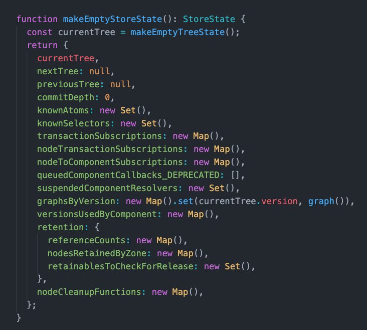 再看一下 storeState 是个什么结构,可以参考 makeEmptyStoreState 方法,发现里面有很多属性,其中的 knownAtoms、knownSelectors、nodeToComponentSubscriptions 比较关键。