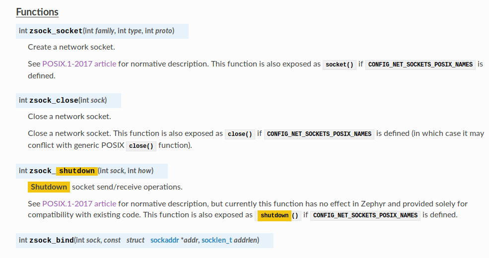 The current idea is that we document zsock_* prefixed symbols, refer to Open Group POSIX website (http://pubs.opengroup.org/onlinepubs/9699919799/) for normative descriptions, and explicitly mention bare POSIX name of a function too (so e.g. users could find it via search). Fixes: zephyrproject-rtos#13397 Signed-off-by: Paul Sokolovsky <paul.sokolovsky@linaro.org>