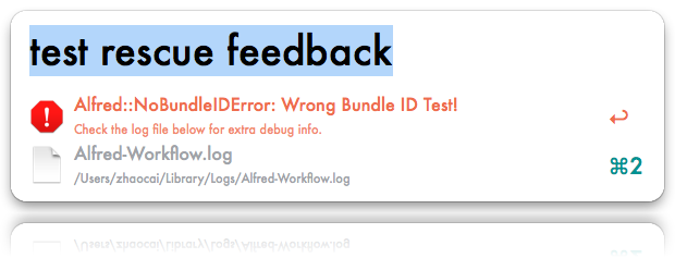 endYou may directly download the alfred2-ruby-template workflow here, install, and play with the keywords: test feedback and test rescue feedback.