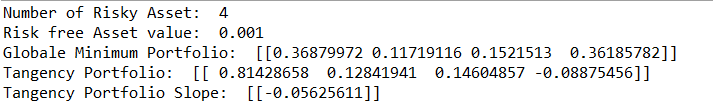 This is a simple calculation of Markowitz Portfolio method to find efficient portfolios,global minimum portfolios, tangency portfolios. A testing function has also being provided to report the proposed return with differenct portfolios.